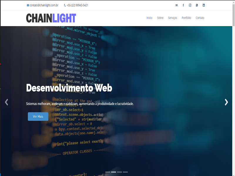 Fundada em 2021 a ChainLight Technology é uma empresa com uma vocação definida: desenvolver soluções de sucesso para negócios. A ChainLight, nasceu da idéia de oferecer soluções de qualidade no setor de desenvolvimento de sites e sistemas Web para empresas de todo o Brasil, com o objetivo de proporcionar aos nossos clientes um novo conceito em desenvolvimento, que agregam valor e otimizam os seus negócios, possuindo ao mesmo tempo qualidade, responsabilidade e competitividade.